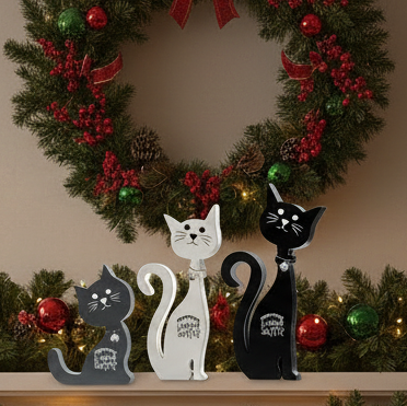 Wooden Standing Cat Ornaments - Set of 3