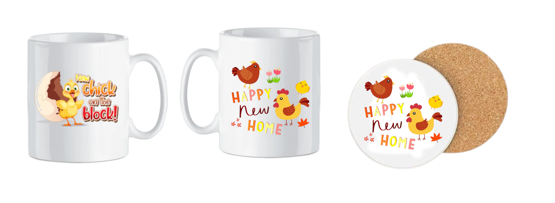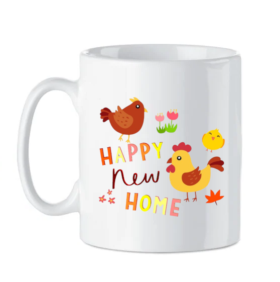 11oz Ceramic mug printed with colourful chicken images and "Happy new home" on reverse. Lovely gift for any occasion.