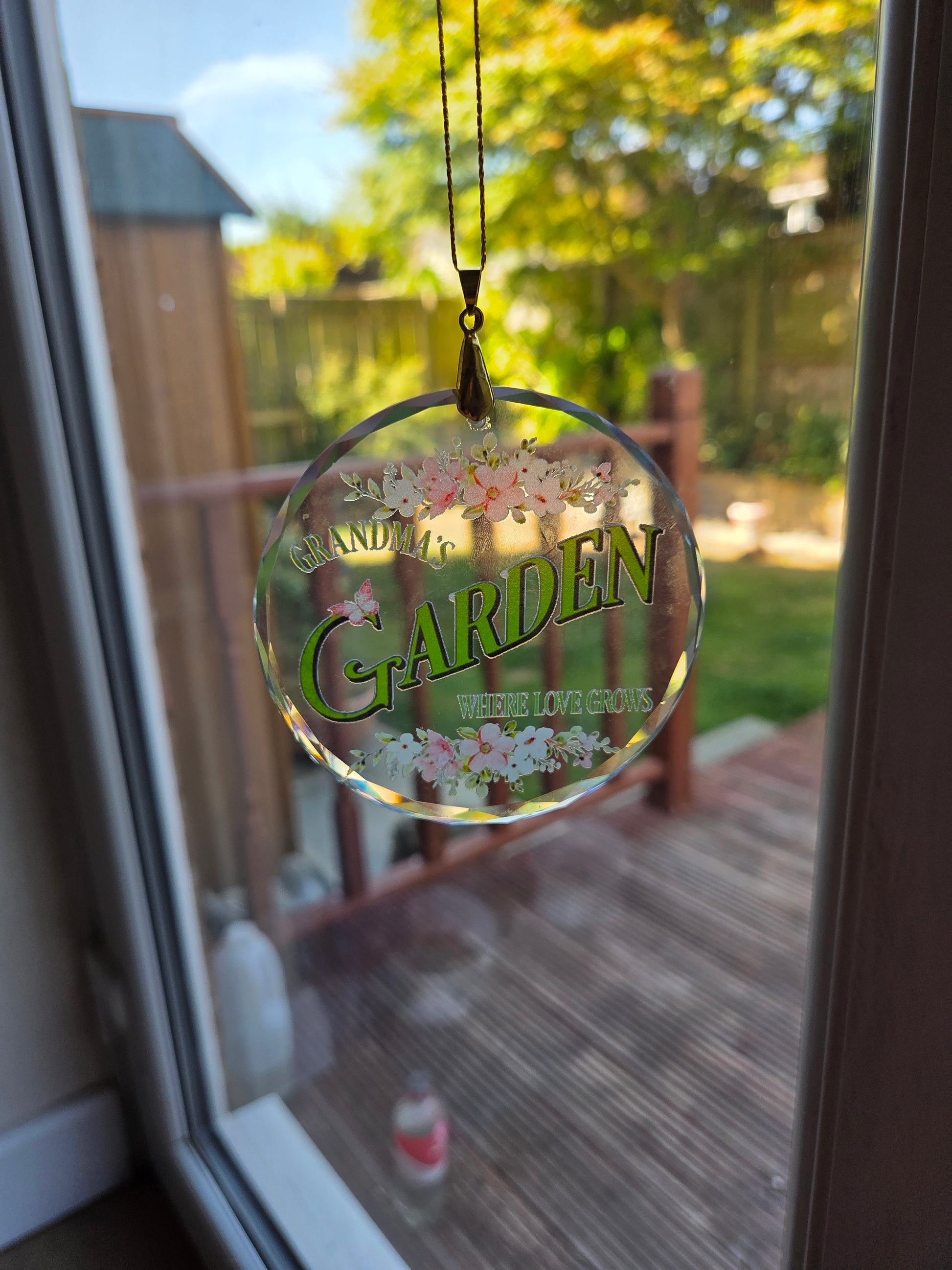 Grandma's Garden Glass Crystal Disc Hanging Ornament. 80mm dia.