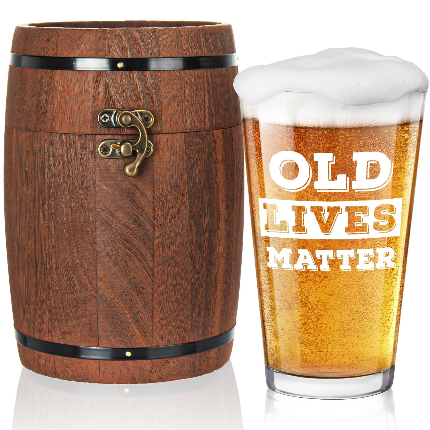 Celebrate milestones with humour and style with the Old Lives Matter Beer Glass. Perfect for birthdays, retirements, or just a cheeky laugh, this unique pint glass comes in a charming barrel-style gift box, making it an unforgettable present.