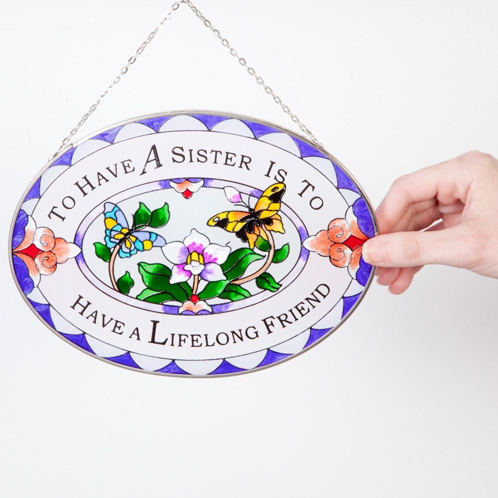 Give a touching sentiment that puts into words the lasting kinship you share with your sister. A beautifully painted art glass suncatcher that catches the light for a stunning window display. A thoughtful gift measuring 8-3/4" x 6-1/2" complete with metal chain for hanging.