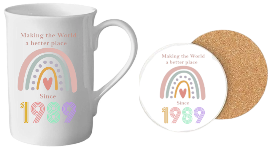 Bone China mug printed with colourful Rainbow image. Any year can be added. Simply add to the personalisation box.