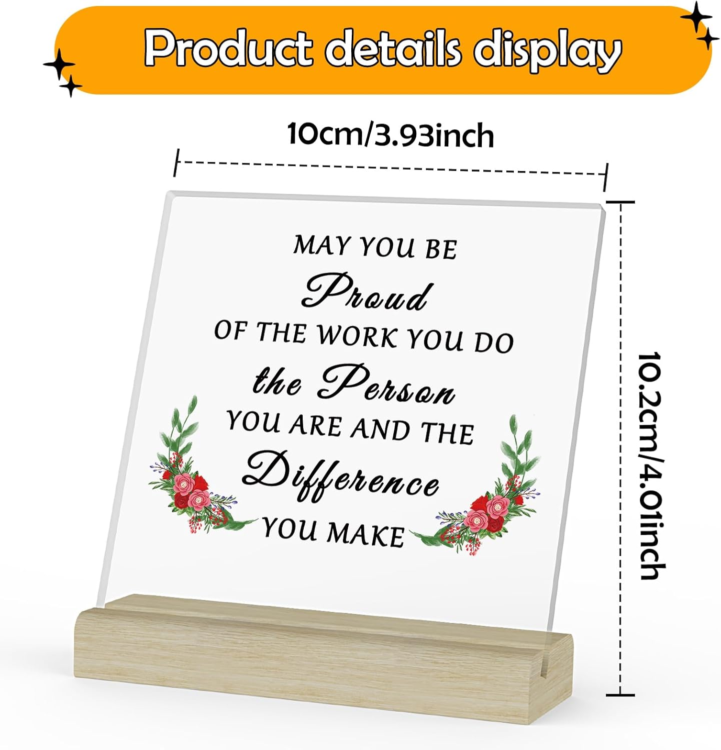 Inspirational Acrylic Desk Decor: This clear acrylic sign gift is designed in a square shape, made of transparent acrylic material, with meaningful words and patterns, good printing technique, and clear graphics and text. The base is made of wood, sturdy and stable. size:3.93x3.93(inch) Square Acrylic, L3.93x W1.37x H0.59(inch) Wooden Stand. which can be placed on the table or desk without taking up too much space, easy to store and carry.